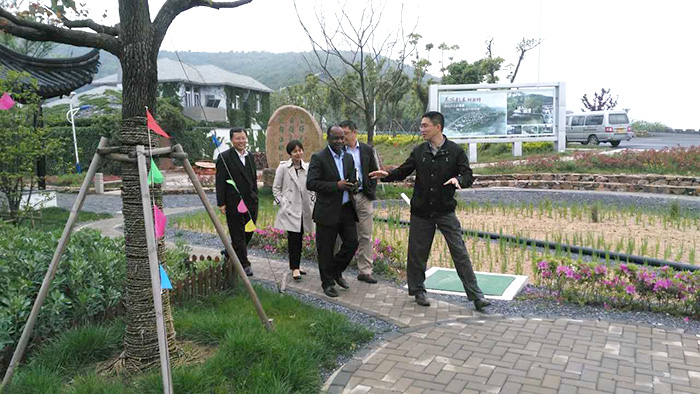 盖茨基金会于2011年启动了“全球厕所创新大赛“,这项大赛期望利用市场导向的研究手段,促进新型、分散卫生排水系统的研发,以帮助政府及其合作伙伴为居民提供优质的公共卫生服务。由于德华生态用于处理农村生活污水的生态湿地实践,与盖茨基金会在此项赛事中的许多理念有不谋而合之处,因此其高级项目官员Mr. Doulaye Kone,刘东和李子富教授专程来到了柯家村生态湿地详细了解项目工艺及应用前景。